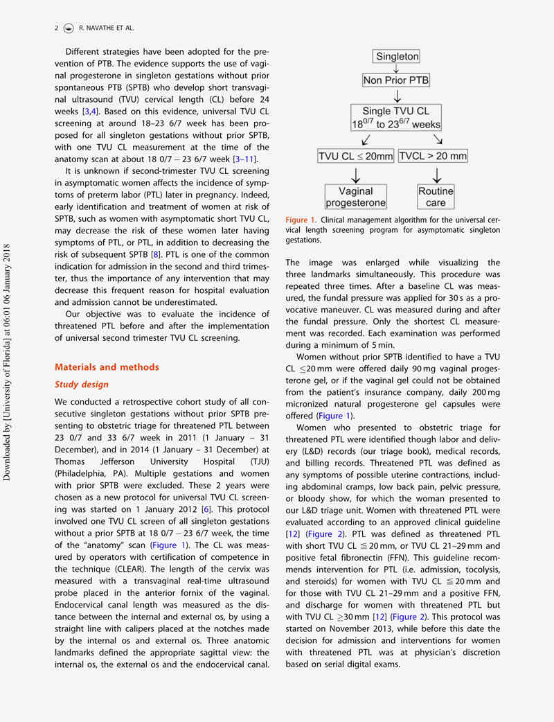 研究設計:這是一項回顧性隊列研究,研究對象是2011年(11日至1231日)和2014年(11日至1231日)因先兆早產在Thomas Jefferson大學醫院(TJU)(賓夕法尼亞州費城)就診的所有孕23 + 0/733 + 6/7周之間且既往無SPTB的單胎妊娠孕婦。自201211日開始起的兩年中開展TVU CL篩查作為新方案。該方案包括對孕18 + 0/7 - 23  + 0/7周所有無SPTB病史的單胎妊娠進行TVU-CL測量(解剖結構檢測)。排除既往有SPTB病史的孕婦。主要結局是先兆早產PTL的發生率,定義為每年在我們 L&D分娩分診單位,既往無SPTB的單胎妊娠出現先兆早產孕婦的人數以既往無SPTB病史的單胎妊娠孕婦的年分娩總人數。次要結局是PTL的發生率,定義為每年既往無SPTB病史的單胎妊娠孕婦每年因PTL入院的人數除以既往無SPTB病史的單胎妊娠孕婦年分娩總人數;以及住院時間。我們旨在比較“2011”組和“2014”組的主要和次要結局。