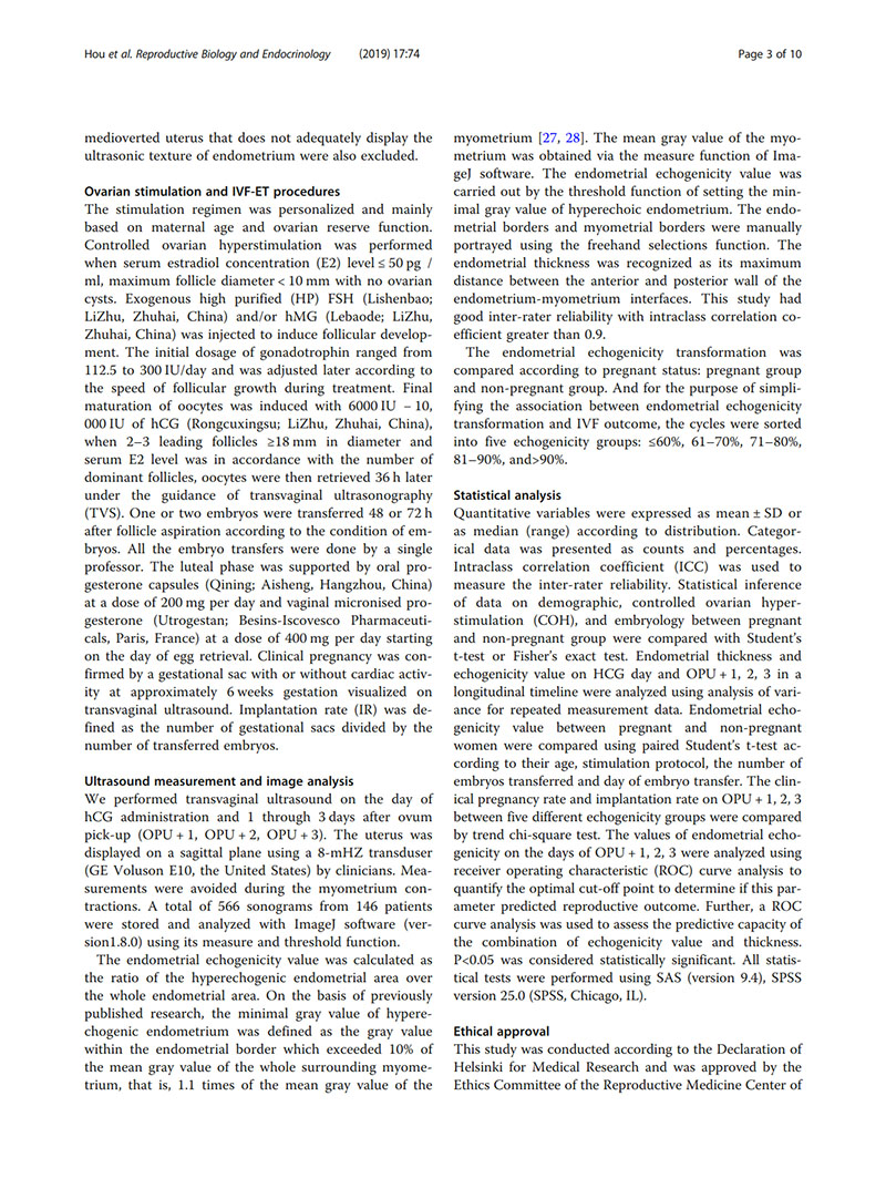 背景:非侵入性測量子宮內膜容受性的方法很有價值,因為它有可能改善體外受精(IVF)結局。有人認為hCG給藥當天的子宮內膜回聲是子宮內膜容受性的良好標志。在日常實踐中,我們注意到胚胎移植日子宮內膜非均質高回聲的患者通常妊娠率較低。因此,我們將延伸擴展了hCG觸發后子宮內膜回聲模式轉化的研究,以分析子宮內膜回聲改變與IVF結局之間的關系。