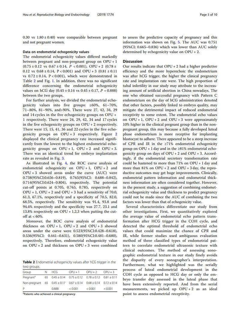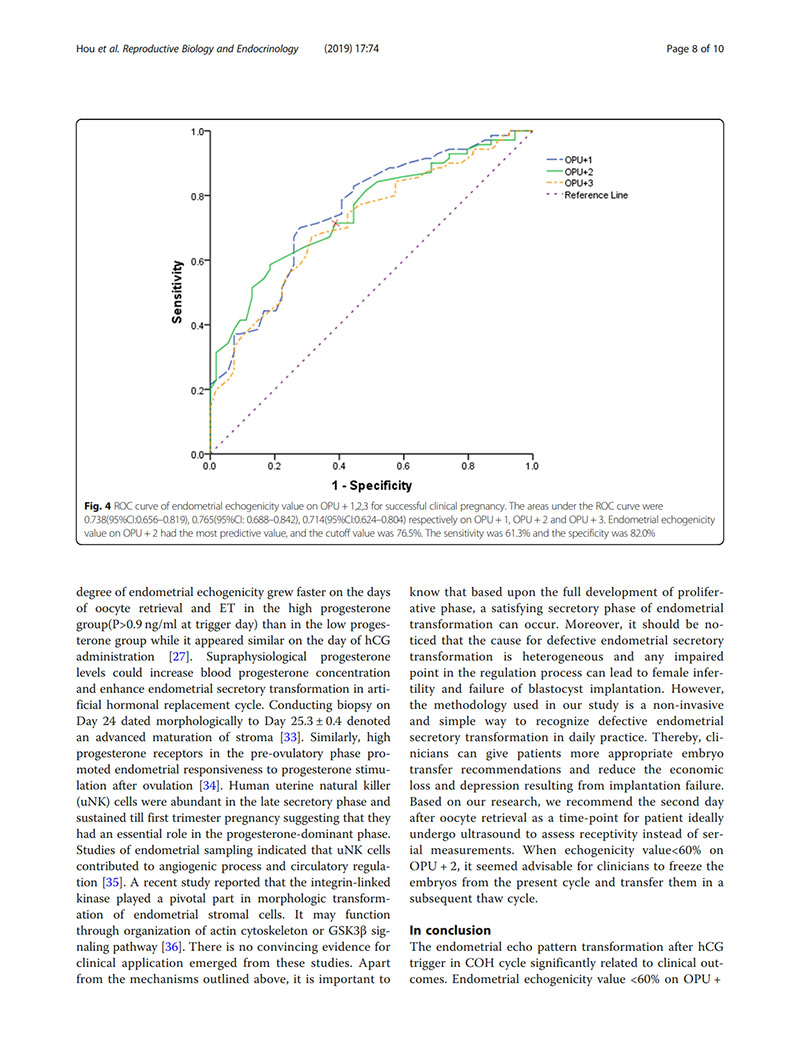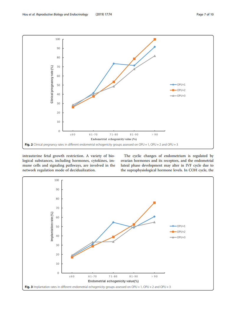 結論:建議用取卵后第2天(OPU+2)的子宮內膜回聲值評價子宮內膜容受性。當OPU+2的回聲值<60%時,臨床醫生似乎適合提供“全冷凍”IVF周期,并在隨后的凍融胚胎周期中進行移植。